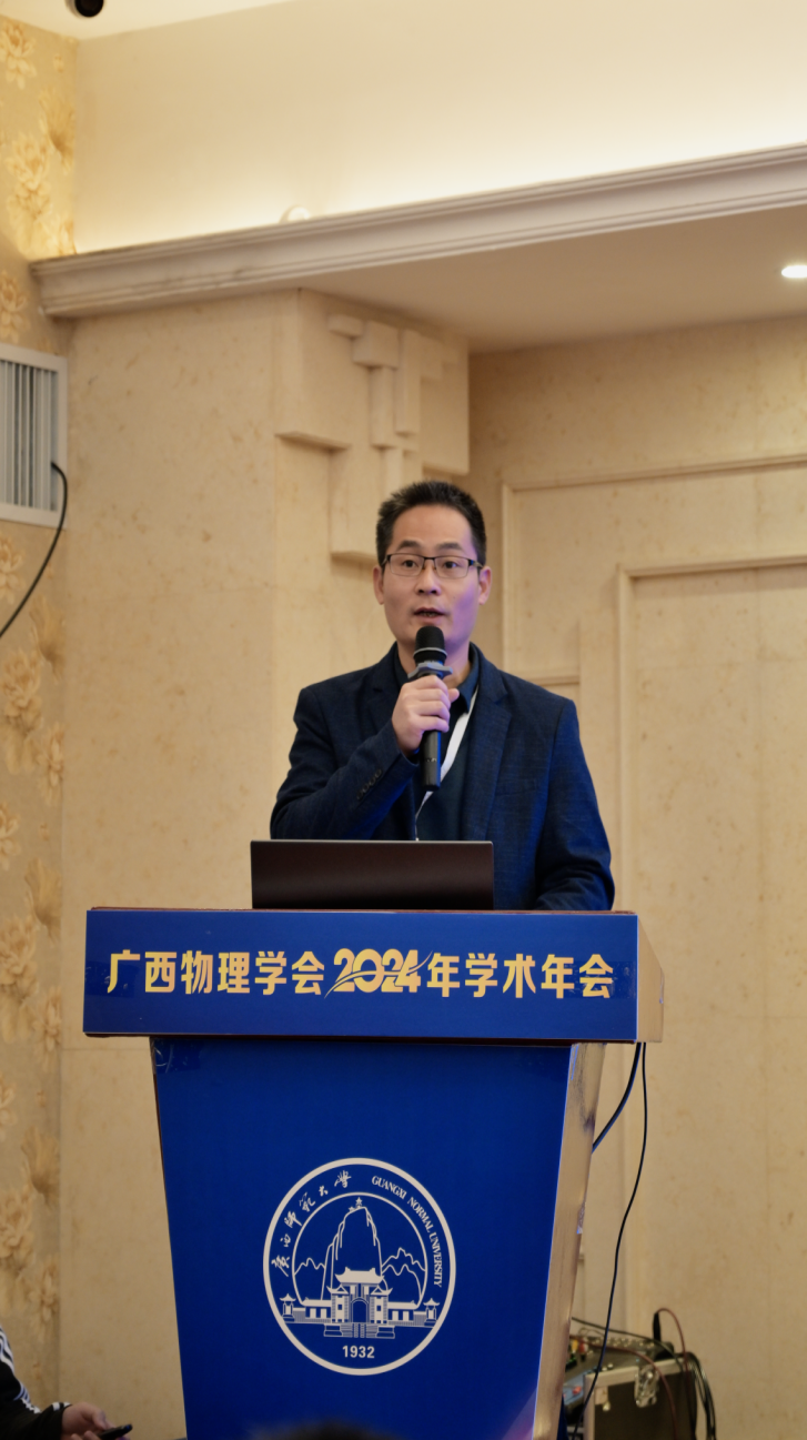 紧接着,梁恩维教授发表致辞。他分享了自己近期的学研交流经历,并强调了物理在科技创新和人才培养中的基础性作用,指出物理学科的发展需要审时度势,寻找发展机遇。广西物理学会副理事长刘宏邦教授从大科学装置、人才、举办国际国内学术会议情况、承担区内高考物理学科自命题工作和中学生物理竞赛等四个方面总结了物理学会过去一年里取得的显著成就。