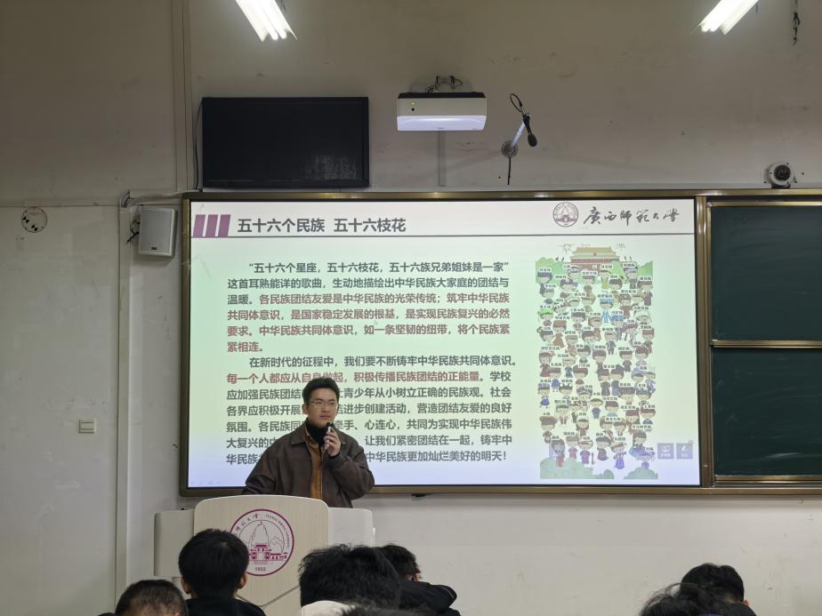 班会上,辅导员带领同学们一同回顾了党百年奋斗历程中国家为民族团结所做的重大决策。他强调,铸牢中华民族共同体意识是国家稳定发展的根基,是实现民族复兴的必然要求,希望同学们能够正确认识民族团结的重要性,自觉维护全国各族人民大团结。他指出,作为新时代青年大学生,应立足于中华民族伟大历史实践和当代实践,讲好中华民族共同体故事,不断巩固发展民族团结。