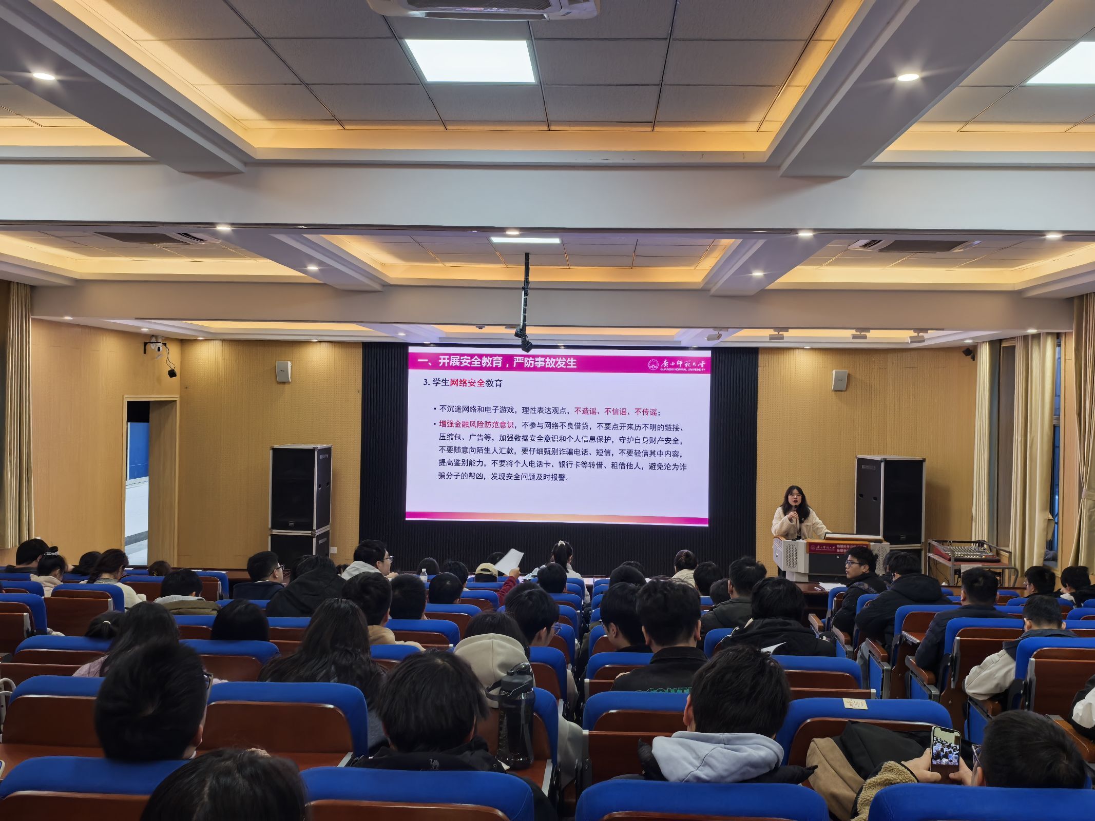会上,首先强调假期的各类安全问题,提醒所有同学在离校前要深入开展安全隐患排查,严防各类事故发生,加强防火、防盗、防骗意识,提高警惕,将安全细节贯穿假期始终。其次,会议对寒假留宿学生的教育管理工作进行了详细部署,提醒留宿学生要养成良好的生活学习习惯,遵守学校留宿规定。最后,辅导员对期末考试、离校报备、临时困难补助等日常事务工作进行了强调,希望同学们严肃考风考纪,诚信应考,按时完成报备手续,确保假期行程安全。