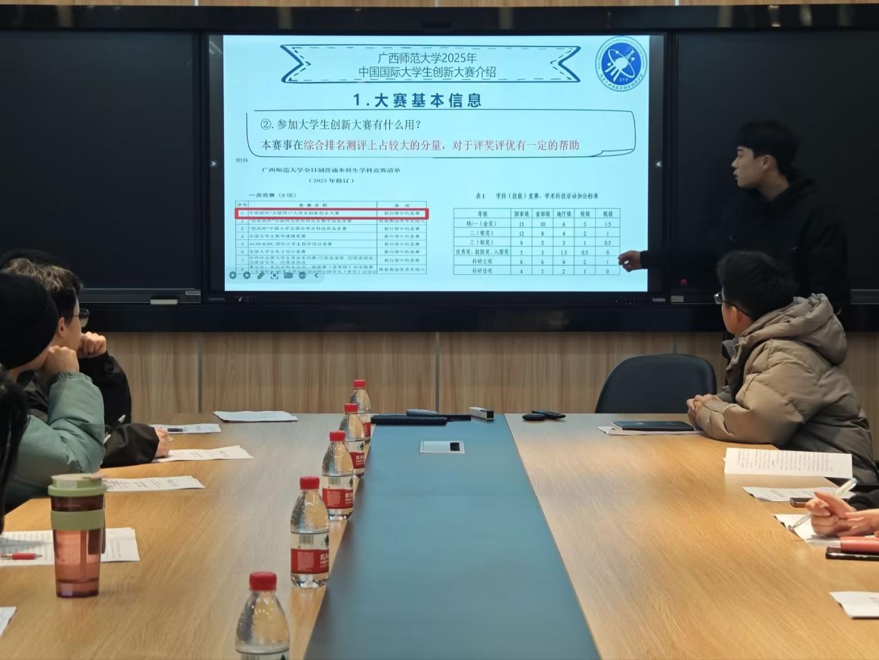 学院新闻为充分调动学院学生参与积极性,提升参赛项目质量,2025年2月25日下午,学院在院办105会议室召开2025年广西师范大学中国国际大学生创新大赛推进会。会议由2024级本科生专职辅导员杨东鹏主持,科协全体成员以及各班学习委员参与。