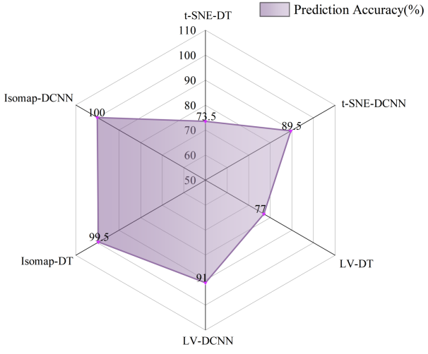 表1展示了6种分类模型训练集和测试集的分类准确率。六种模型的训练集准确率都高于测试集准确率,这代表着6种模型都在训练集上能够学习到数据的关键特征,有效捕捉到数据的结构,具有较好的泛化性能。其中,t-SNE-DT的分类准确率仅为73.50%,t-SNE-DCNN的分类准确率为89.50%,LV-DT的分类准确率仅为77.00%,LV-DCNN的分类准确率为91.00%,Isomap-DT的分类准确率达到了99.50%,Isomap-DCNN的分类准确率达到了完美的100.00%。