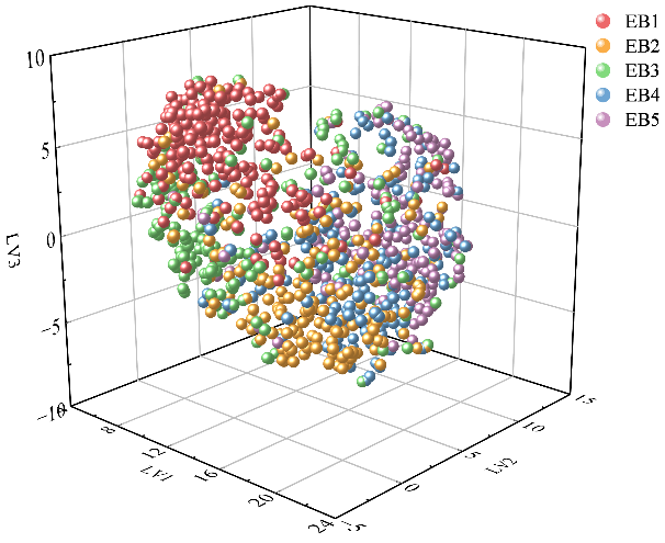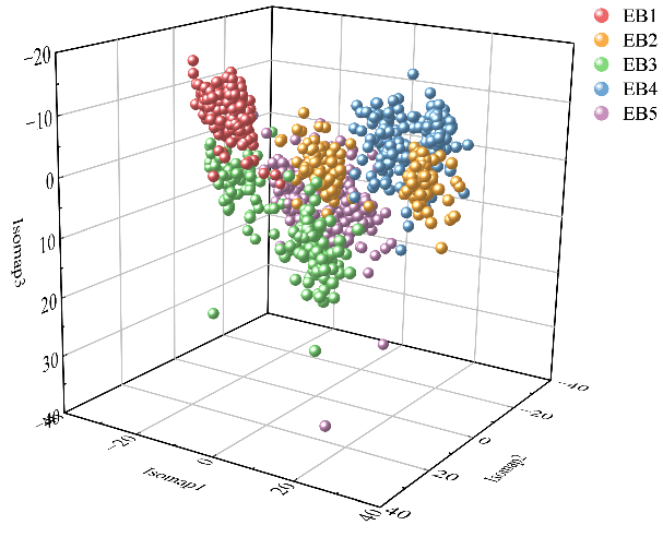 图2展示了不同转基因甘蔗经降维处理后的可视化结果。图2(a)展示了t-SNE降维的可视化,可以观察到类内样本点的聚集紧密度较低,且类间样品点的分离度不佳,边界模糊。这可能会影响对数据全局结构的准确表征,从而影响最终的分类效果。图2(b)展示了LV 降维的可视化结果,LV降维作为一种对t-SNE降维的优化,其整体降维效果与t-SNE相似,但在某些方面表现更佳。具体来说,LV降维在保持类内样本点的紧密度方面表现出与t-SNE相似的效果,但在类间样本点的分离效果上有所提升。特别是对于EB1样本点,LV降维初步实现了与其他四种转基因甘蔗样本点的分离,这一点相较于t-SNE降维是一个进步。图2(c)展示了Isomap降维的可视化,五种转基因甘蔗样品点初步实现了分离,不同种类样品点的类间距离明显增大,这增强了分类器的鲁棒性,能有效提高分类识别准确率。图2(d)显示了各降维方法的轮廓系数,其中,经t-SNE降维的数据的轮廓系数为0.285;经LV降维的数据的轮廓系数为0.320;经Isomap降维的数据的轮廓系数为0.385,为三种降维方法中最高。这表明,经Isomap降维的数据在类内紧密度和类间分离度方面效果最好,聚类质量最优。为了准确识别五种不同转基因甘蔗,有必要进一步采用机器学习和深度学习的模型对THz光谱数据集进行定性识别。