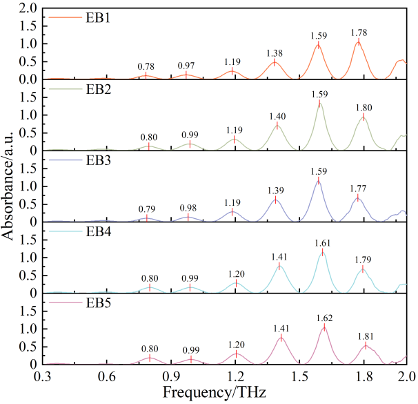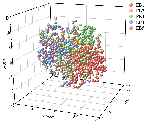 图1(a)给出了应用Tukey窗函数后五个转基因甘蔗品种的平均THz吸收光谱。图1(b)给出了对平均光谱进行基线校正增强THz吸收峰可视性后的图谱。五个转基因甘蔗品种的THz吸收光谱的总体模式是相似的,不同品种之间的峰形状和位置略有不同。其中,EB1的THz吸收光谱的峰位置明显不同于其他转基因甘蔗品种,而EB2、EB3、EB4和EB5在峰位置和值上仅表现出微小的差异。这对准确鉴定不同的转基因甘蔗提出了挑战。