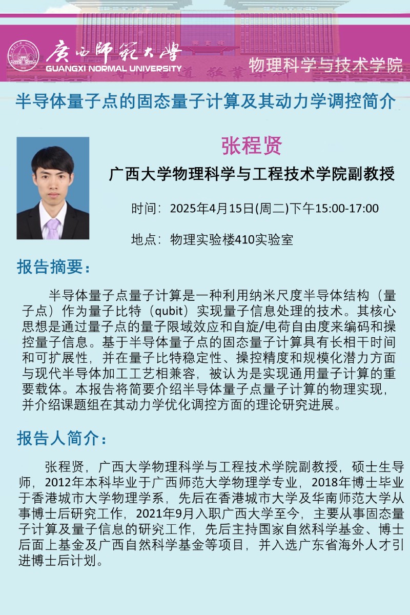 【学术预告】张程贤:半导体量子点的固态量子计算及其动力学调控简介
