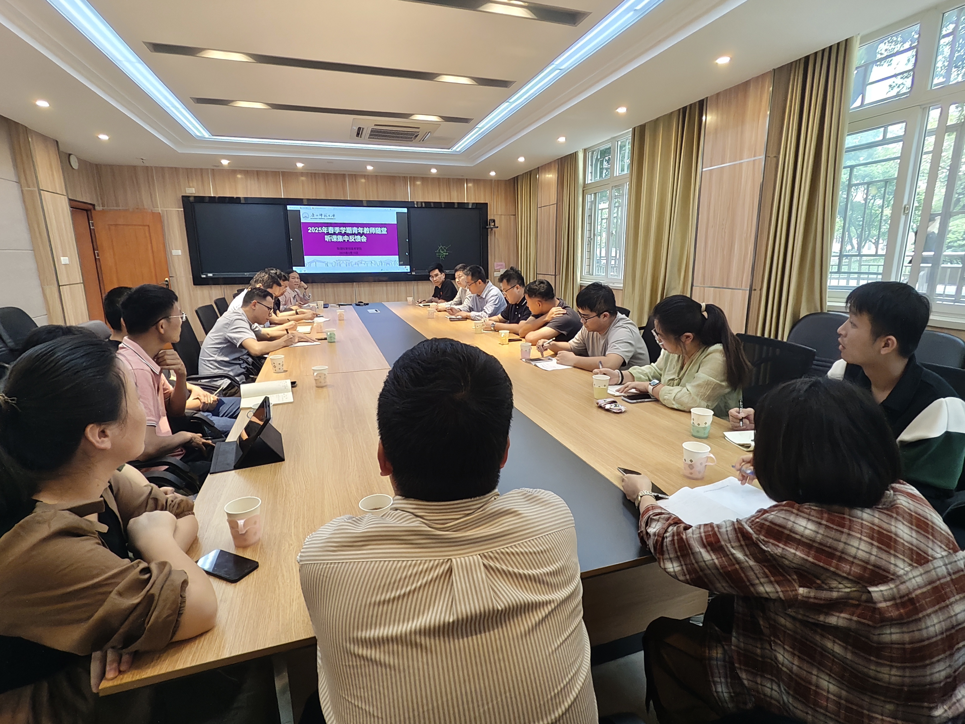 当天下午,在物理学院办公楼 105 室召开了集中反馈会。听课老师们从教学设计、方法、内容等多方面进行点评。大家一致认为,授课青年教师课前准备充分,精神饱满,教态自然,语言清晰流畅,展现出扎实的理论知识和良好的精神风貌。整体上,授课青年教师们对课程内容娴熟,注重内在联系,讲解重难点突出,新课导入自然,举例恰当,获得了听课老师的高度认可。