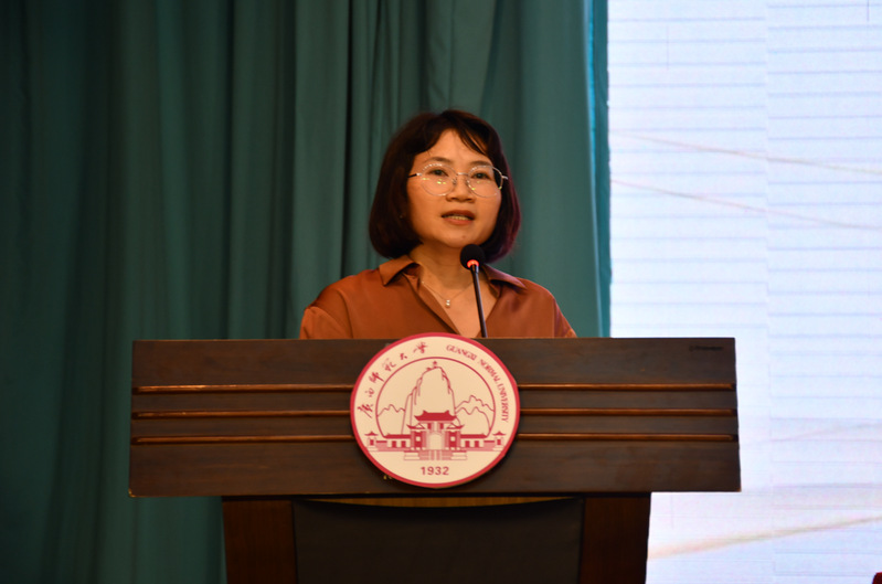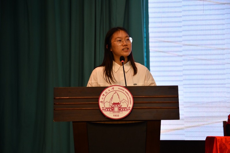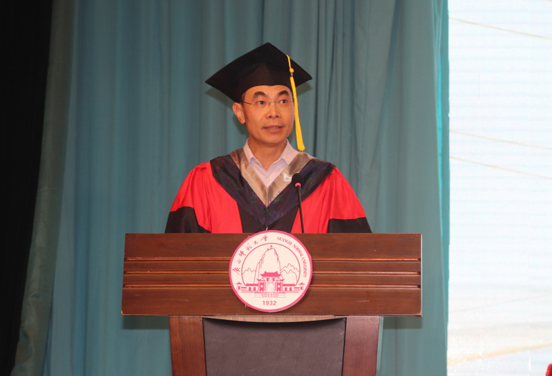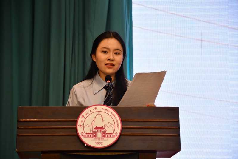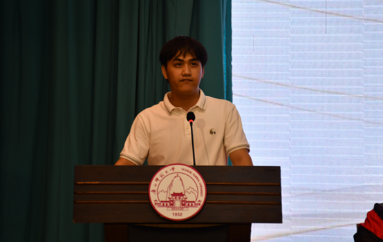 教师代表秦丽清老师寄语毕业生要恪守学术初心,以严谨态度迎接未来挑战。毕业生代表依次发言:本科生方子欣同学以“种子萌芽”比喻成长历程;硕士生钟文虎同学结合乡村支教经历,诠释师范生担当;博士生蓝礼礼同学分享科研实践感悟,立志以所学回馈社会。
