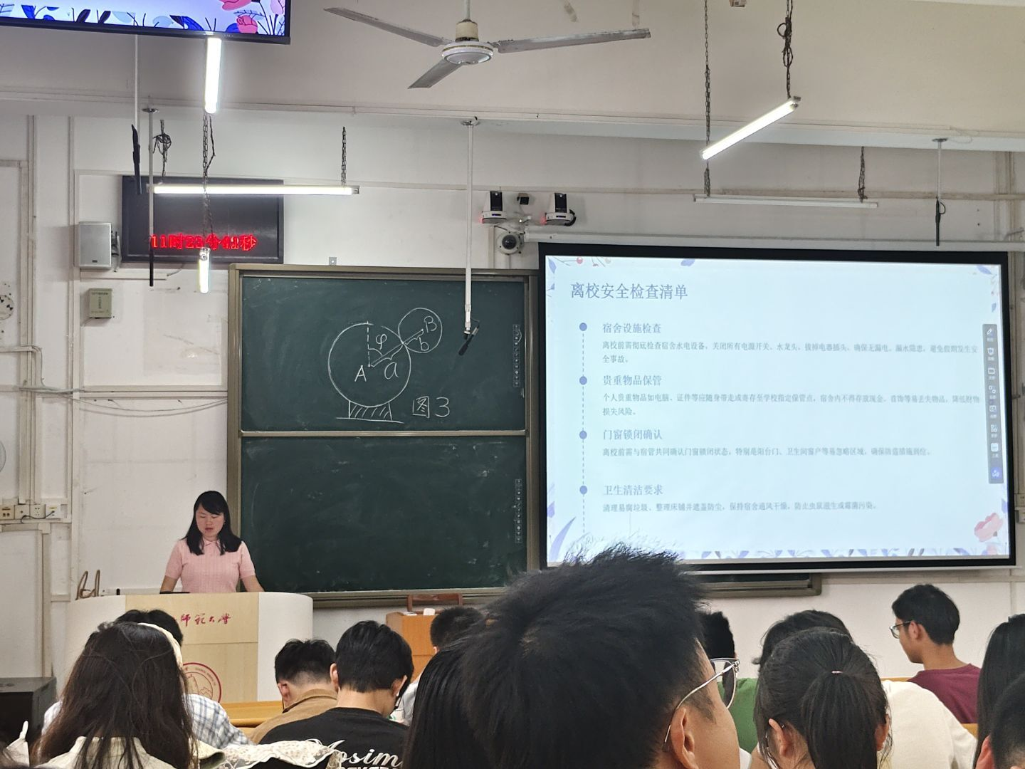 辅导员柳莲君老师围绕暑假安全教育与假期规划主题,结合典型案例展开讲解。第一,明确假期时间与注册安排,针对留校学生,要求提交书面申请并注明理由,经审核后统一安排集中住宿。第二,规范离校与留校管理流程,离校前需完成宿舍水电设备检查、确认门窗锁闭、携带贵重物品、清理易腐垃圾等。第三,介绍暑期社会实践专项内容,要求同学们紧密结合专业展开实践,相应社会热点,提升实践时效性与社会责任感。第四,助力学生规划个人暑期成长路径,师范生可聚焦教学技能提升,科研方向学生要深耕前沿课题,参与实习兼职的学生需做好资质审核、协议签订及应急防护等安全措施。最后,强化安全责任与应急处理,重点强化消防管理、实验室危化品存储等安全隐患,全方位筑牢安全防线。