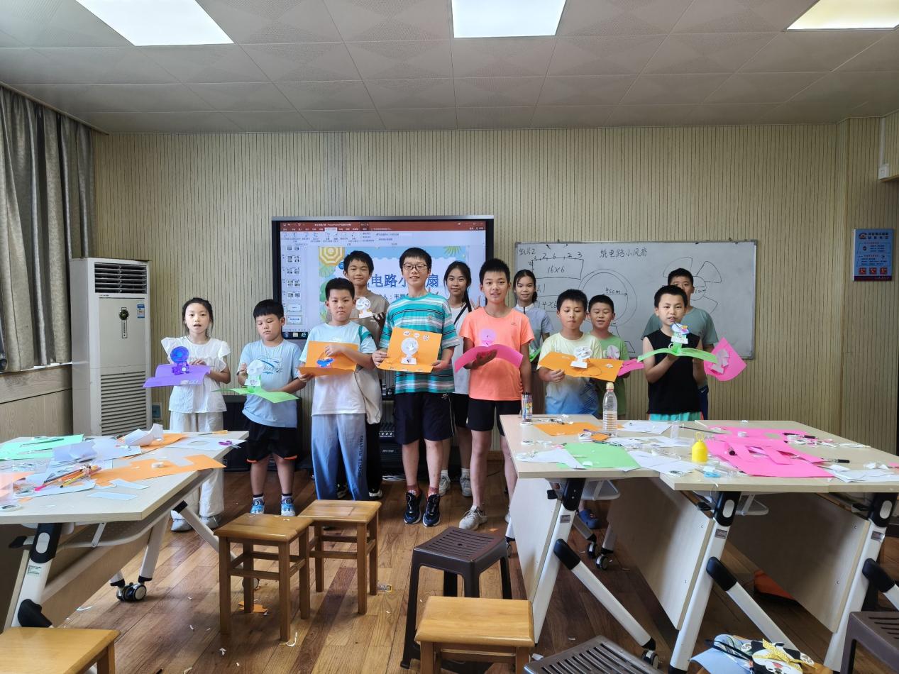 动手环节,学生在主讲老师与助教老师的引导下专注制作自己的纸电路小风扇。在课堂尾声,参营学生拿起成功制作好的纸电路小风扇与老师共同拍照留念。