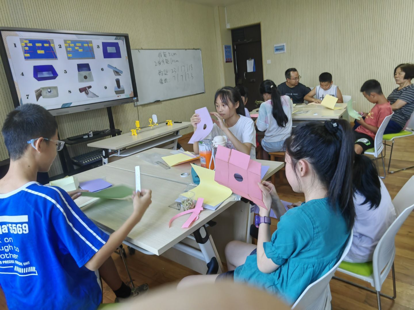 课堂中,主讲老师通过桂林山水景色摄影作品引出“掌心相机”这一核心课题,并详细讲解了光的传播原理及相机制作步骤,在助教的引导下,家长与学生共同完成“掌心相机”的制作。